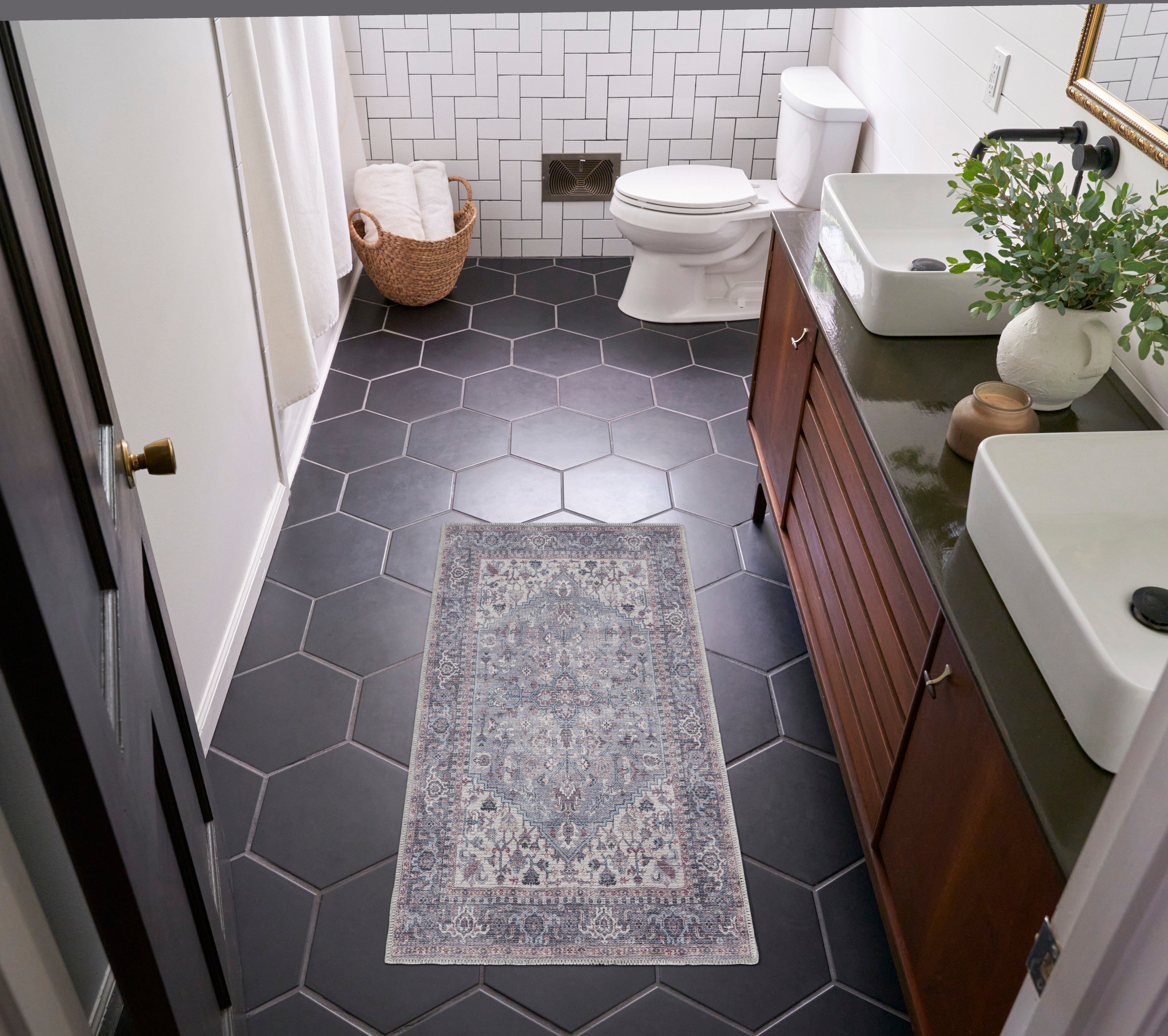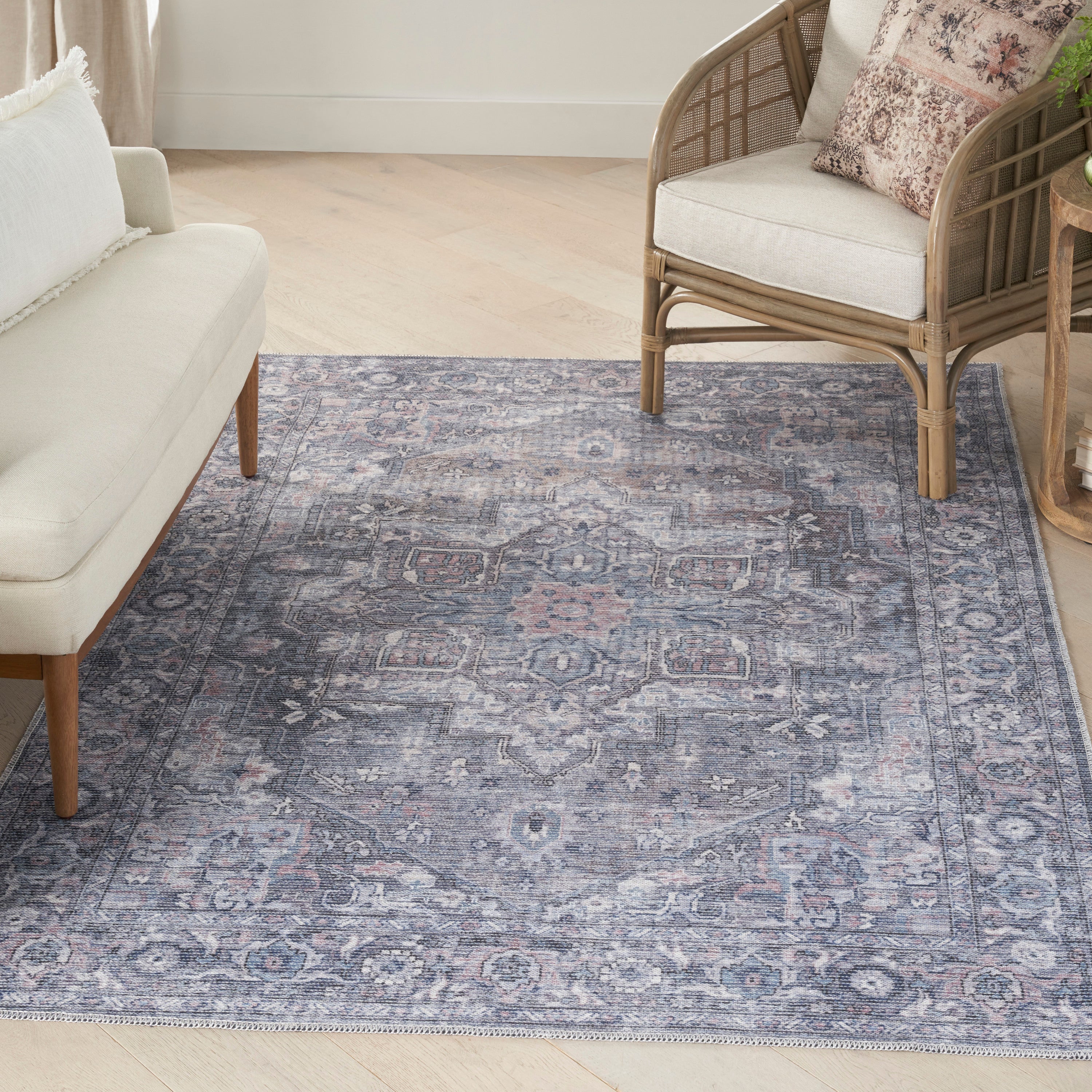 The New Concept Washables Collection channels the vibrant spirit of the past through intricately printed Persian floral and tribal designs. These vintage-inspired rugs create a welcoming sanctuary in your home, with each design featuring a distinctively distressed finish for a lived-in charm. New Concept rugs are crafted with a machine-washable blend of flat woven chenille and cotton fibers, offering a soft texture and easy cleaning.